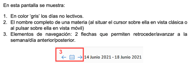 La pantalla Horario permite visualizar el horario lectivo de la semana actual asociado a la matrícula consultada: