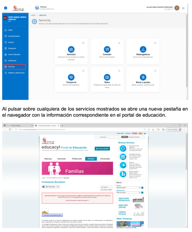La pantalla Servicios muestra accesos directos al portal de educación (www.educa.jcyl.es) correspondientes a los servicios más demandados por las familias: