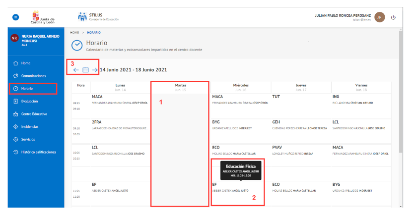 - El horario lectivo de la semana actual.