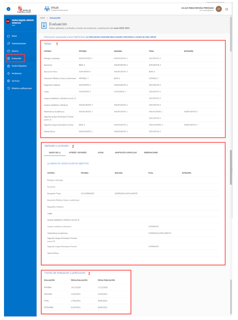 - Un Resumen por evaluación y materia de las ausencias, retrasos e incidencias de comportamiento asociadas a la matrícula.
