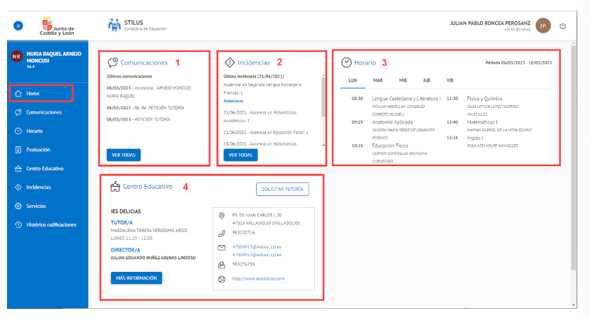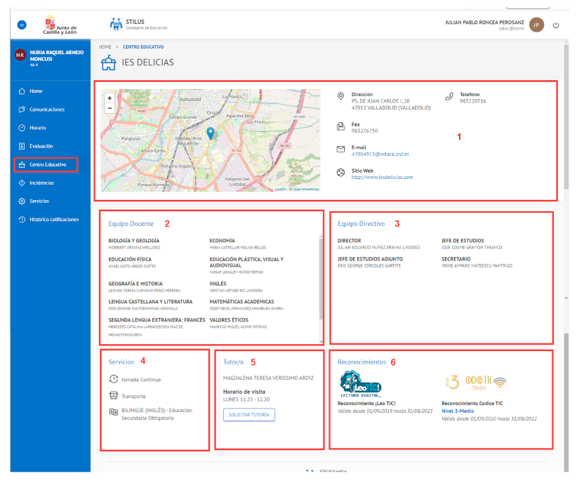- Los datos básicos del centro educativo: Tutor, Director, información de contacto y acceso al botón para ‘Solicitar tutoría’.